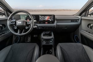 The car’s exterior features distinctive performance-driven elements to set it apart from the standard model, such as a larger rear spoiler and widened flares to accommodate larger, high-performance tires. The inside features a newly designed steering wheel with customizable drive-mode buttons, and N sport bucket seats. There are also driver-selectable N e-shift and N Active Sound+ functions that mimic the sensory feedback of traditional internal combustion engine vehicles.