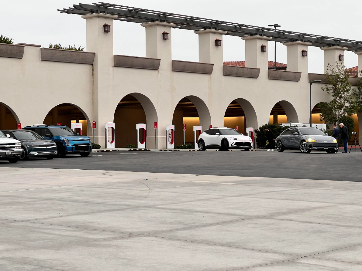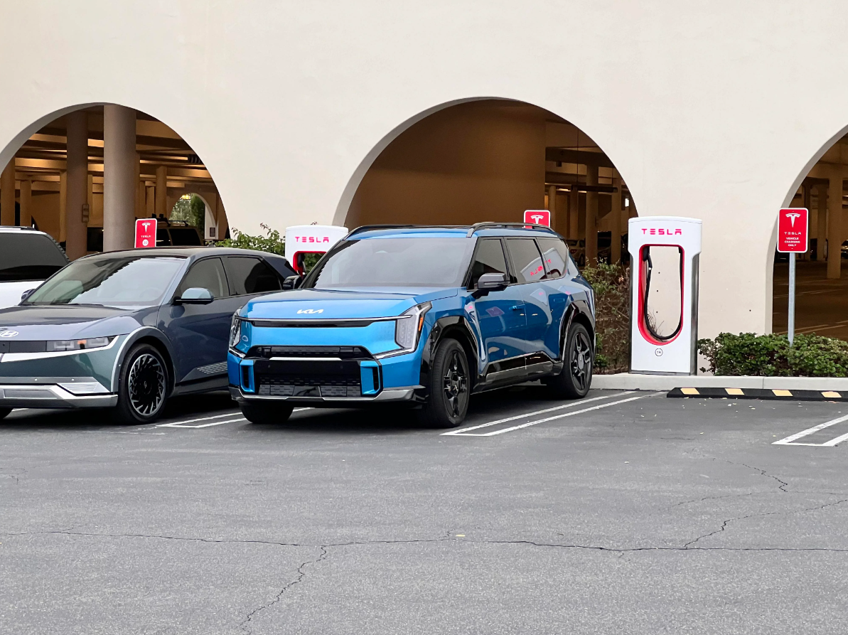 According to photos shared on Reddit, a Hyundai IONIQ 5, IONIQ 6, Kia EV9 (which hasn’t been released yet), and Genesis GV60 were spotted doing a photoshoot this morning at the San Clemente Supercharger, with all of the EVs being setup to make it look like they were plugged in and charging. (h/t: @The_EVGuy)