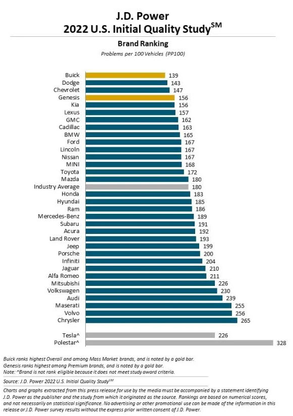 Buick owners reported the least problems, with 139 PP100. The brand is followed by Dodge and Chevrolet. In the premium segment, Genesis came first and fourth overall. It is followed by Lexus and Cadillac.