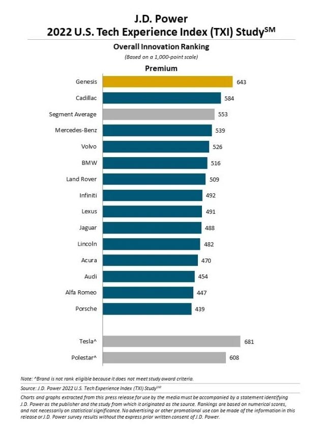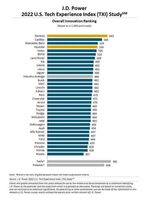 For the second year in a row Genesis has been ranked as top automotive brand by J.D. Power in their 2022 Tech Experience Index Study (TXI). Also for the second year in a row, Tesla actually ranked higher but was excluded from the official results because the automaker doesn’t meet the firm’s ranking criteria.