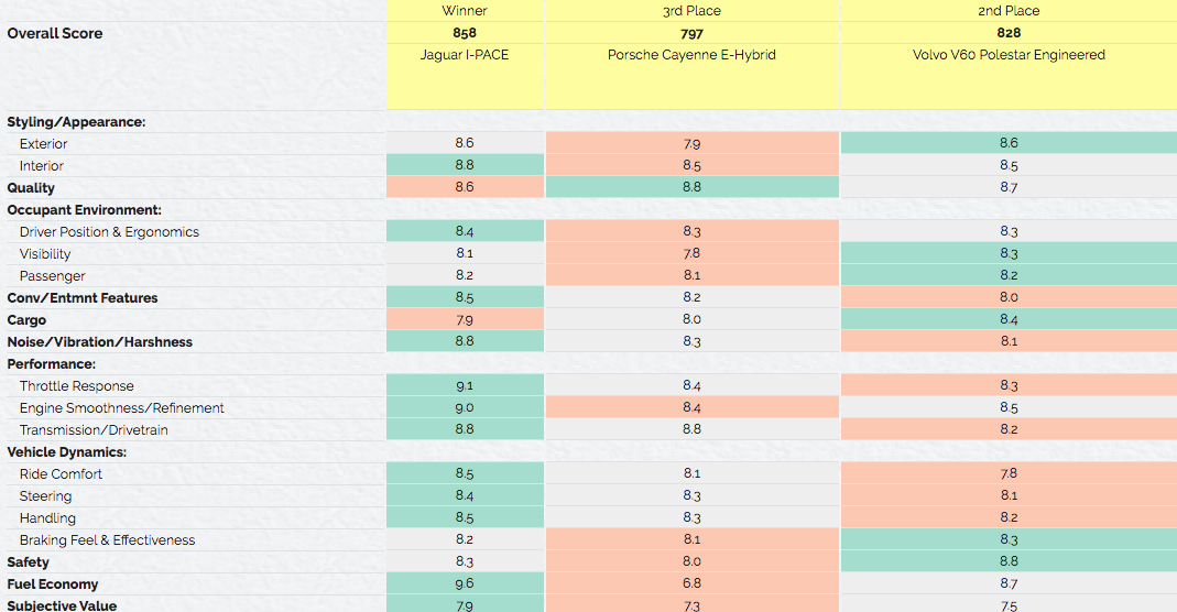 In the category of Premium EV, the i-Pace beat out the likes of the Volvo V60 Polestar Engineered in second place 30 points behind, and the Porsche Cayenne E-Hybrid in third place a further 31 points behind the Jaguar.