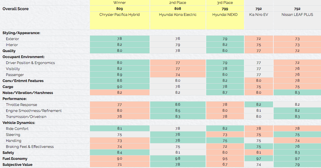 There was also another category for best EV, and that award went to the Chrysler Pacifica Hybrid. The Hyundai Kona Electric was just one point behind in second place, with the Hyundai NEXO taking third. The top 5 was rounded out with the Kia Niro in fourth and Nissan Leaf PLUS in fifth.