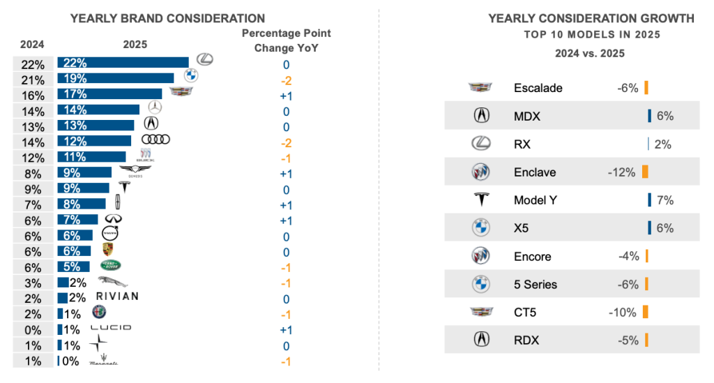 In the luxury category, Tesla remained one of the most considered brands in 2025, with overall interest holding steady year over year in ninth place. However, the study shows that Genesis has now edged ahead, reflecting a more crowded luxury EV landscape than in previous years.