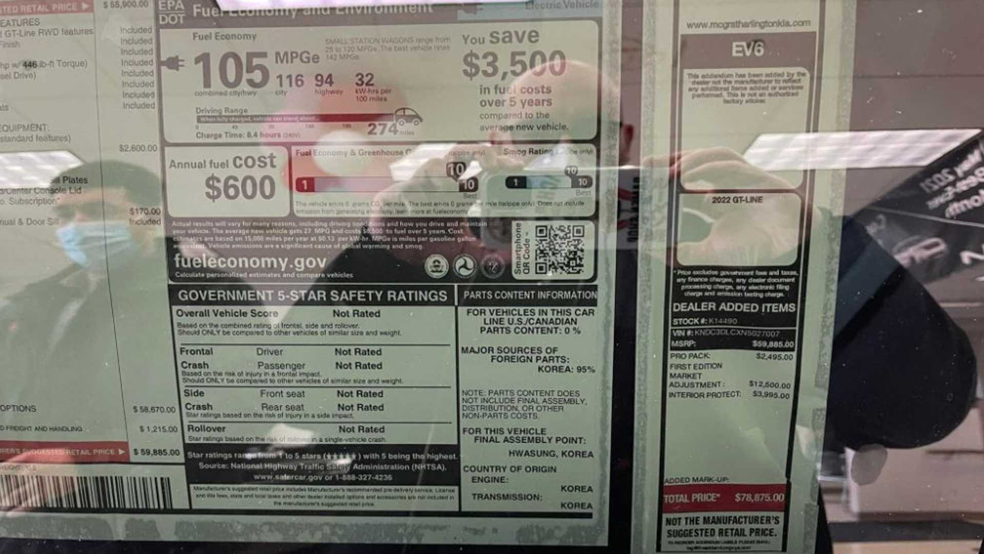 One of those dealerships is McGrath Arlington Kia in Palatine, Illinois. According to a photo of a window sticker taken by auto journalist Anthony Fongaro, the EV6 First Edition on their showroom floor is $18,490 more expensive than the MSRP.