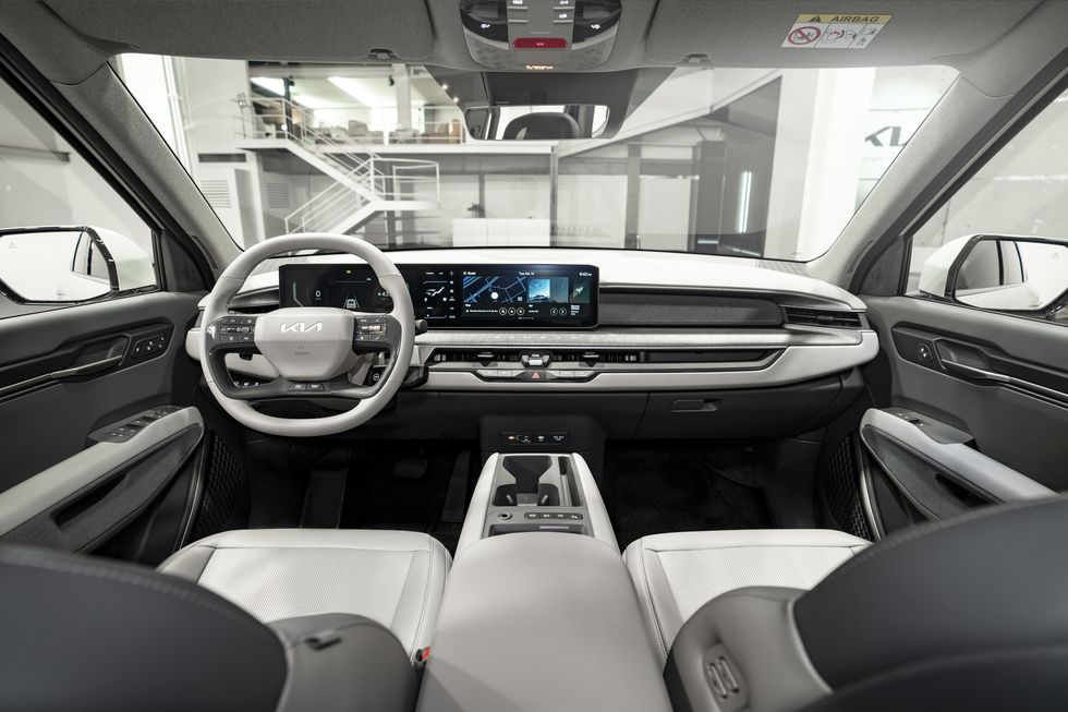 On the inside, the vehicle has a minimalist design with two 12.3-inch screens. In between, the screen is an HVAC readout. Interestingly, there are not many knobs or buttons, with Kia opting to go mostly touchscreen with the EV9. The infotainment system is also a new generation, but Kia did not detail what features it will have.