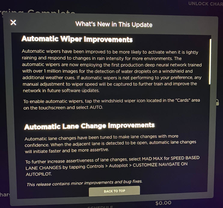 We reported earlier this month that this release would feature Deep Rain, Tesla’s neural net for improved wiper behavior in changing weather conditions, and it has been included in this official release to non-EAP owners.