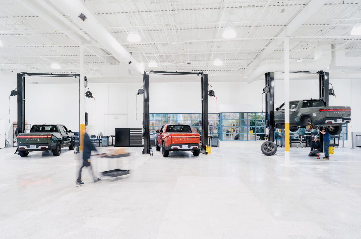 The service area features six vehicle lifts, each one equipped with a Rivian Level 2 charger, and a large storage area for parts and accessories.