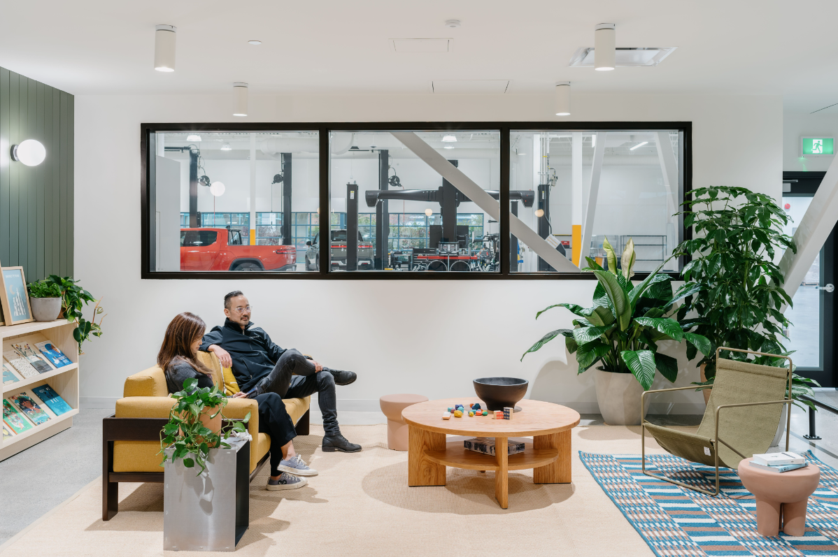 Owners waiting to drop off and pick up their R1 vehicles can wait in the customer lounge area that borrows design cues from the Rivian Hub in Venice, California.