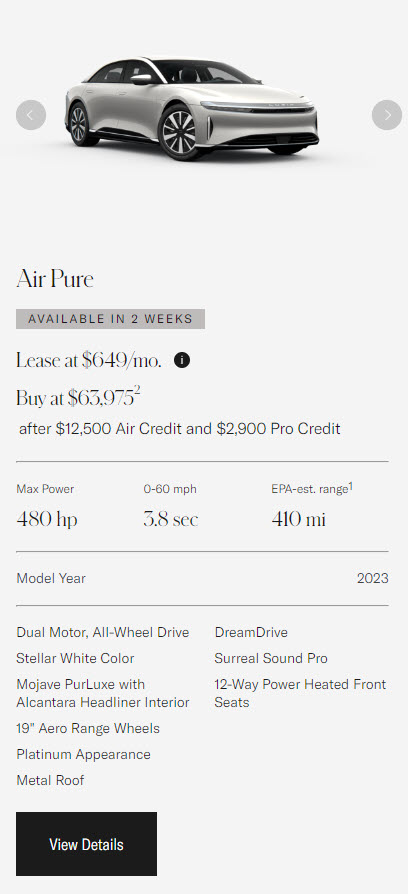 But perhaps more enticing for most buyers, the Lucid Air Pure model, the entry-level model with an officially listed MSRP of $79,375, now falls below $60,000 with the combined discounts. For example, below is a 2023 Air Pure with the $12,500 Air Credit, $2,900 Pro Credit, listed for $63,975. Add in the $5,000 On-Site Vehicle Bonus, and that price drops to only $58,975.