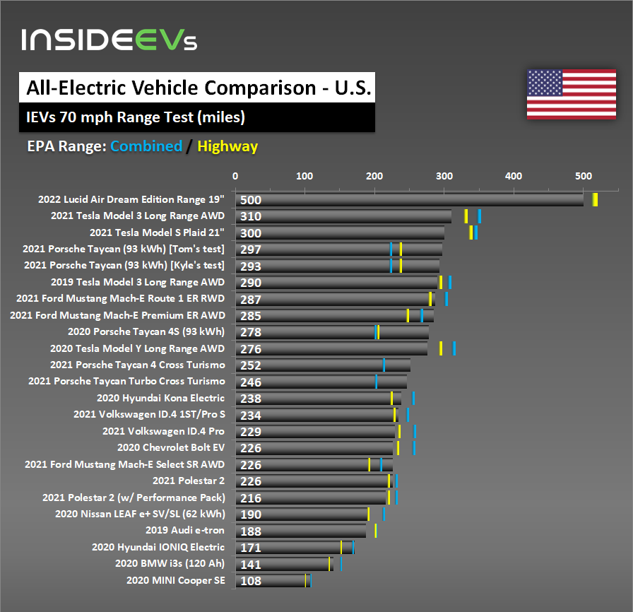 The 2022 Lucid Air Dream Edition Range shattered the competition. The vehicle beast the 2021 Tesla Model 3 Long Range AWD by 190 miles. You can check out all the InsideEVs 70-mph results, and the video, below.