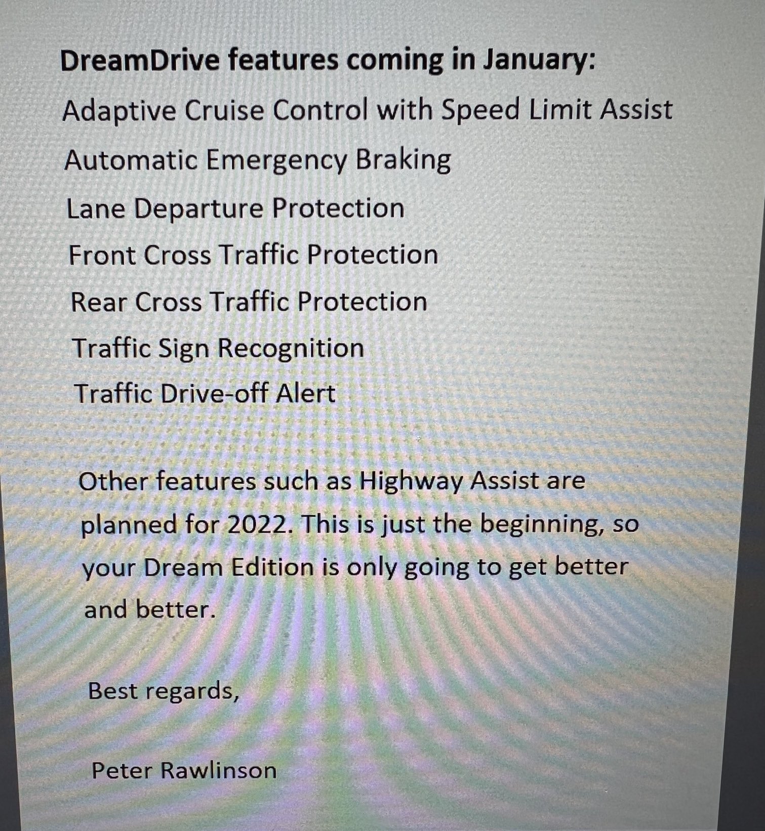 According to a copy of the release notes shared by @drelectricauto on Twitter, it includes DreamDrive Part 2, which adds the missing features promised by Rawlinson in the email.