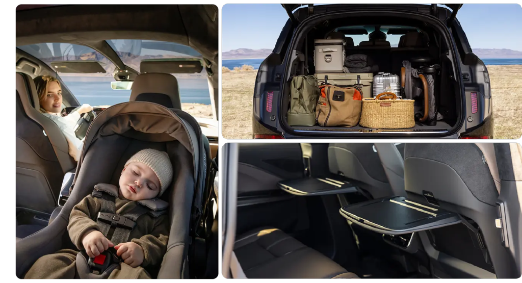 Lucid designed the Gravity Touring around family versatility, offering both five and seven-seat configurations, up to 120 cubic feet of cargo capacity, and a massive 8.1 cu-ft frunk that can optionally transform into a rear-facing bench for campsite or tailgate-style seating.