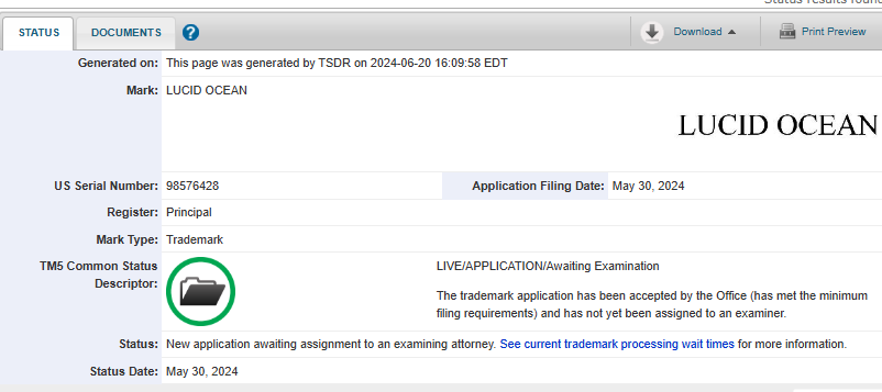 Lucid Ocean trademark application courtesy of the USPTO