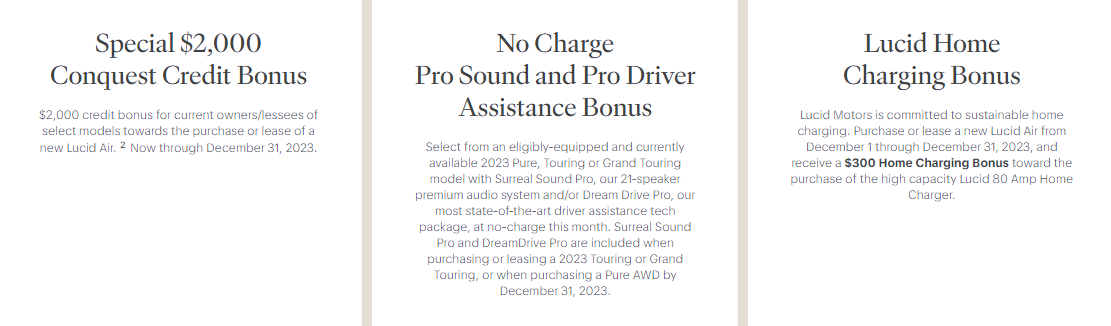 In a bid to try and reach their target, Lucid has slashed prices across its lineup, and now the company is targeting their biggest rival, Tesla. In a new “Electrify Your Holidays” sale event published on their website, Lucid is offering existing owners or lessees of any Tesla vehicle a $2,000 discount on the purchase of a 2023 Air sedan. Calling this offer a “Conquest Credit Bonus,” it is available through December 31, 2023 and also available to any BMW, Mercedes-Benz, Genesis, Audi, Porsche, Lexus, and Land Rover owners or lessees.