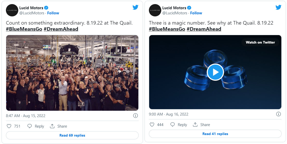 8.19.22. #BlueMeansGo #DreamAhead#MontereyCarWeek pic.twitter.com/GnW5XpxZYS— Lucid Motors (@LucidMotors) August 11, 2022