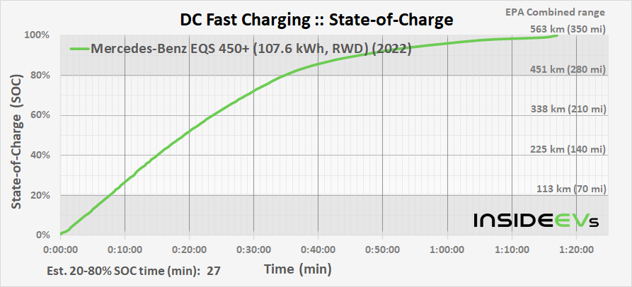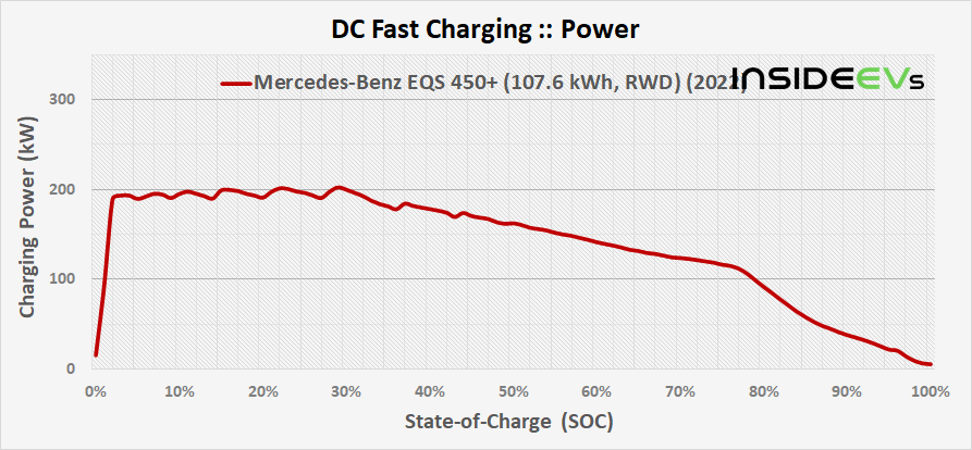 Charging power in the EQS quickly raises to the max of 200 kW and remains there until about 1/3 of total battery capacity. From 10% to 80% of capacity it fills up the battery in 31 minutes.