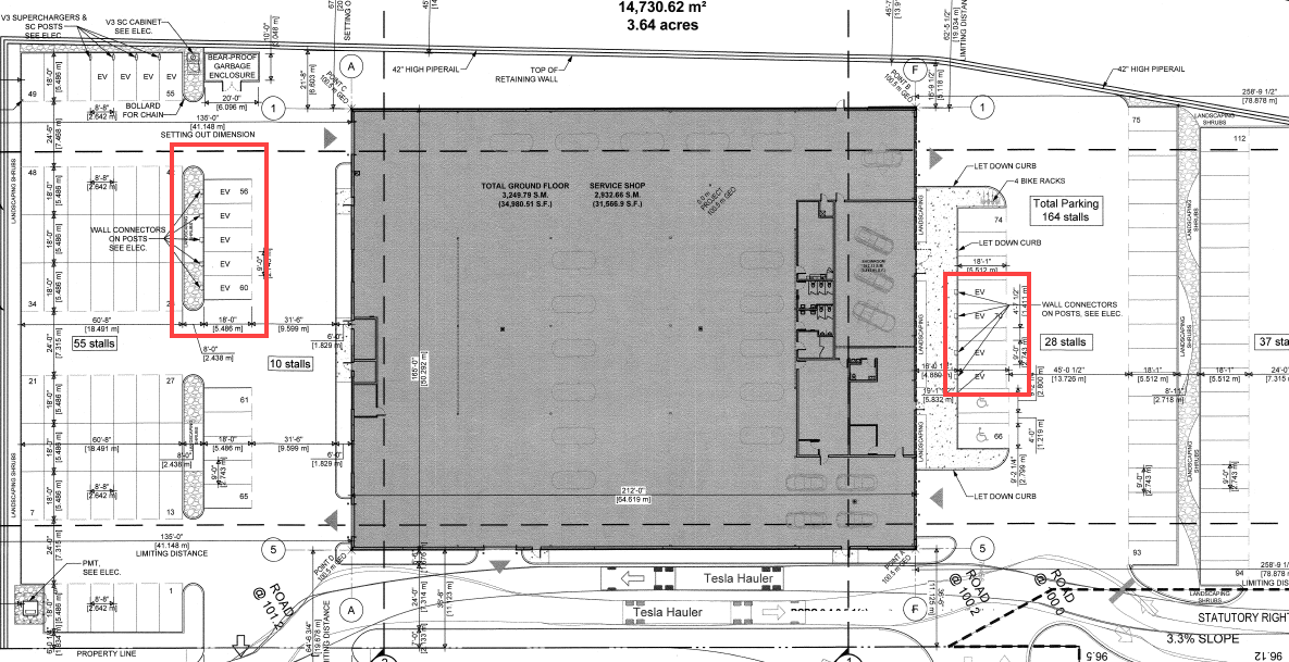 UPDATE 10:08am PT: According to one of our readers who is involved in the project, these Supercharger stalls will not be available to the public and will be reserved for internal use only. The plans do show two “bollard for chain” will be installed on either end of the 7 parking stalls, so we are assuming a chain will be put up to keep owners from using the Supercharger.