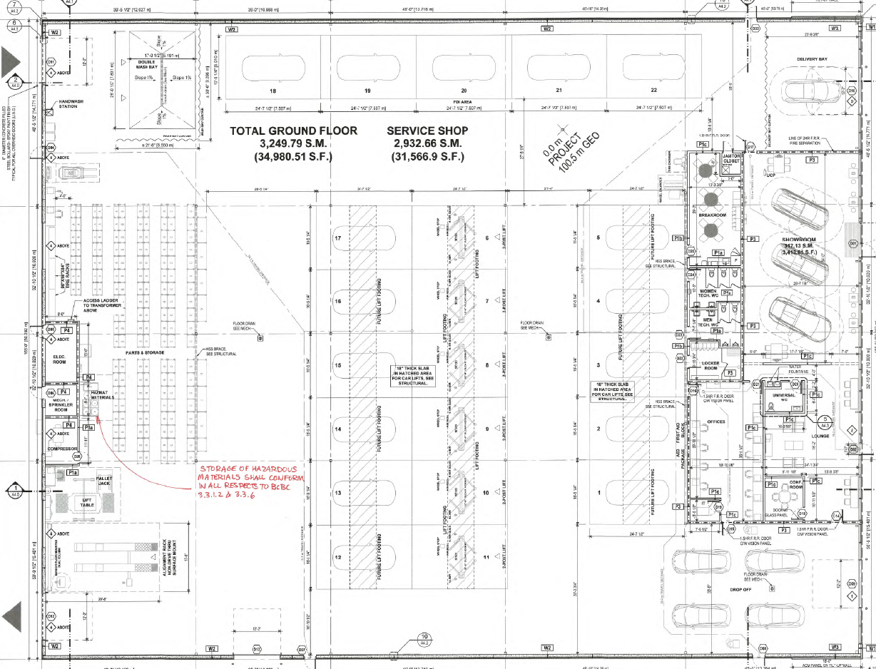 The plans reveal the service area will be equipped with 6 vehicle lifts in the center of the building, but space has been designated to add another 11 lifts in the future. A large area at the rear of the building has been set aside for parts and storage.