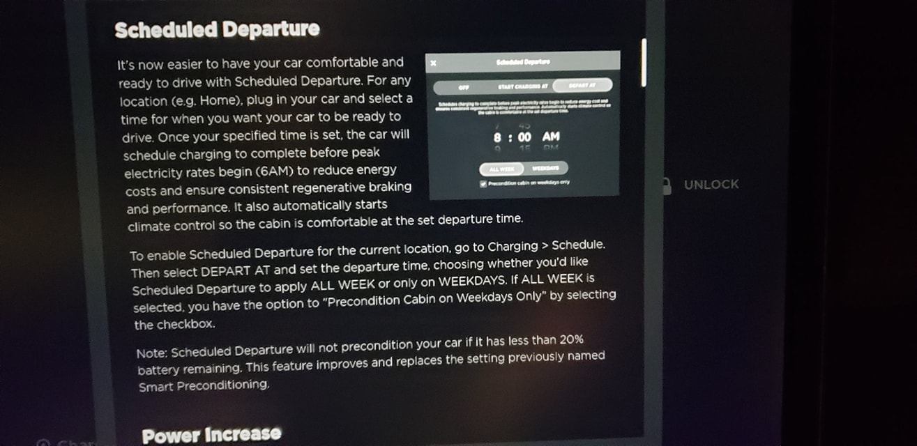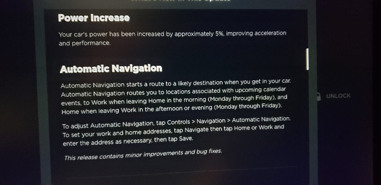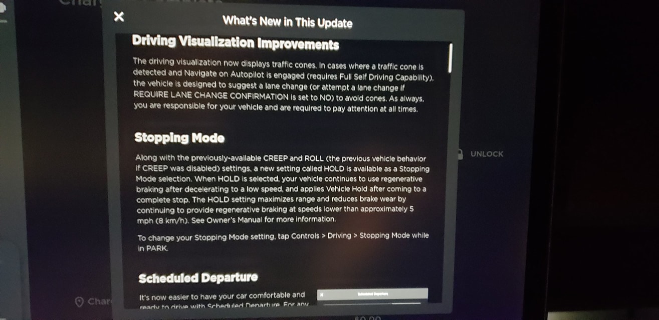 Some of the newest features include several the Tesla CEO Elon Musk alluded to on the Tesla Q3 2019 earnings call last week, including the 5% power increase, scheduled departure charging, stopping mode (single pedal driving), and automatic navigation.