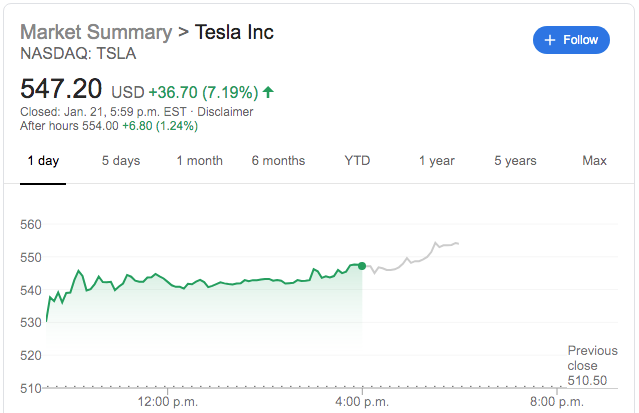 Following the news, Tesla shares (TSLA) had a strong day Tuesday closing up more than 7% for the day at $547.20, and reaching a new all-time high at $554 in after-hours trading.
