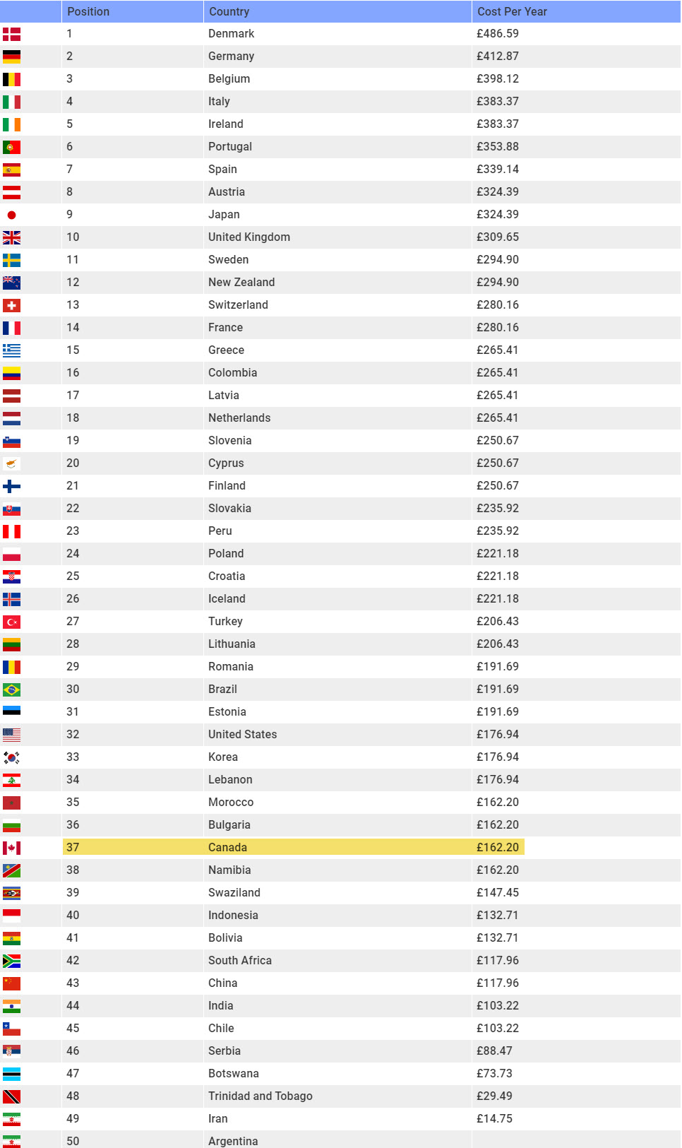With that methodology, USwitch found the average cost to charge an EV in Canada is just ~$277 CAD per year., making it the ninth cheapest country in the world in their analysis.