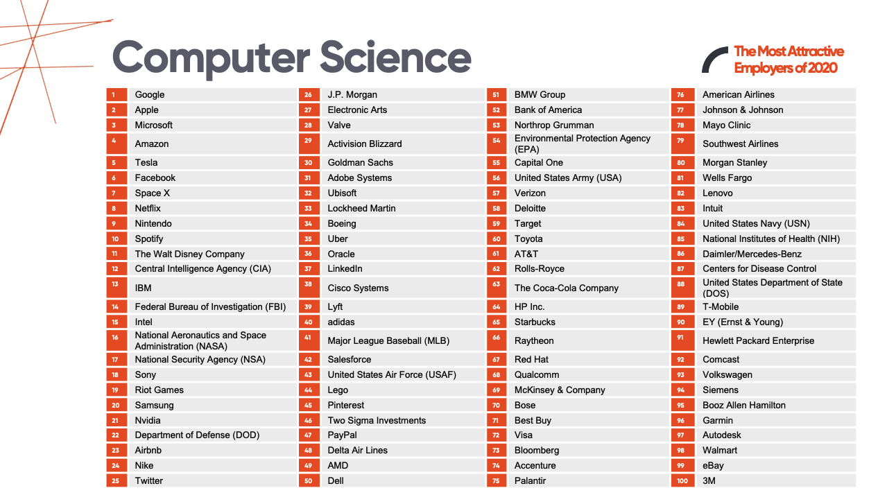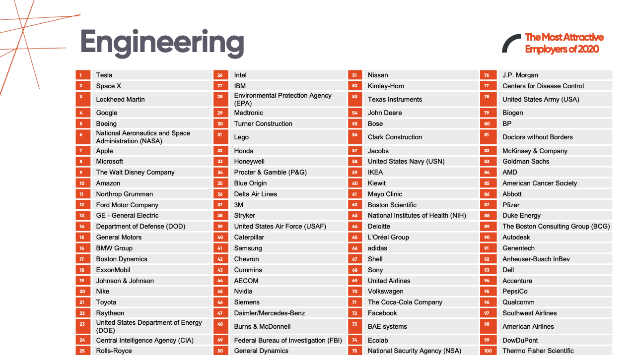 Both Tesla and SpaceX cracked the top 10 in the areas of Business/Commerce and Computer Science, but Tesla ranked first for Engineering, with SpaceX coming in second.