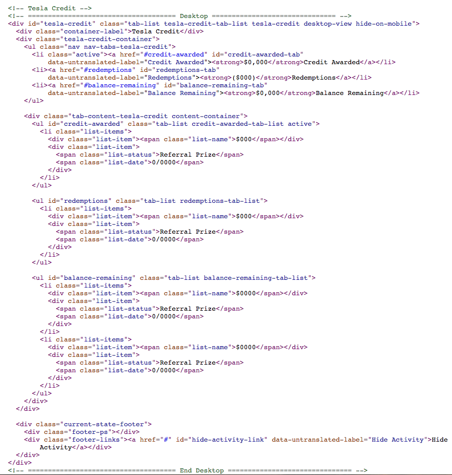 In the code, there is a new section called ‘Tesla Credit’. Below that are three boxes, which shows the amount of ‘Credit Awarded’, amount of ‘Redemptions’, and your ‘Balance Remaining’. There is also another section below that which appears to indicate the number of referrals you have made that goes towards a ‘Referral Prize’.
