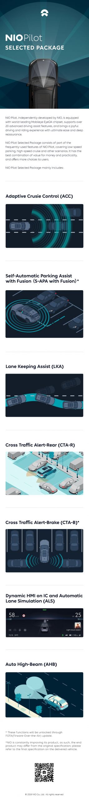 NIO is also separately repackaging their suite of driver-assist features into two new options. The first is a cheaper “Selected Pack”, which is available as an upgrade for about $2,000, and includes: