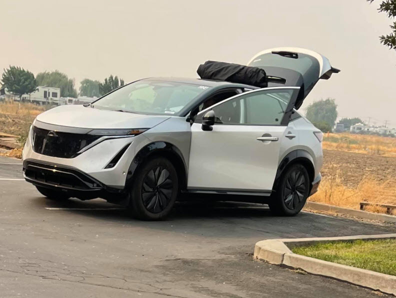 The test vehicle was spotted at the Best Western Plus hotel parking lot, the same lot where the Patterson Tesla Supercharger is located. Model X owner Andrea Torrance was plugged in at the Supercharger when the Ariya pulled in with only its emblems covered.