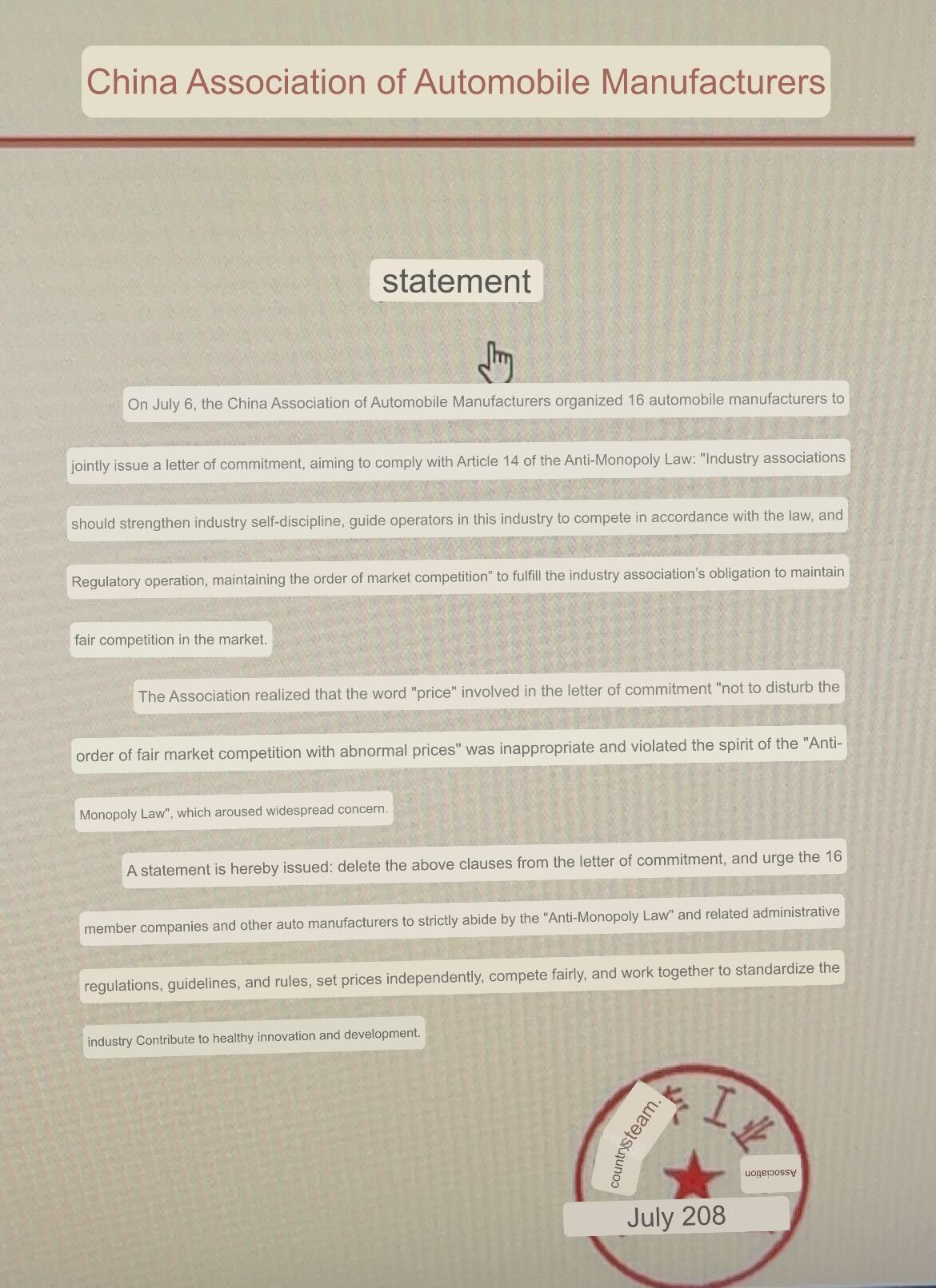 The statement goes on to encourage the 16 automakers to “strictly abide by the anti-monopoly law and related administrative guidelines and rules and set prices independently…”