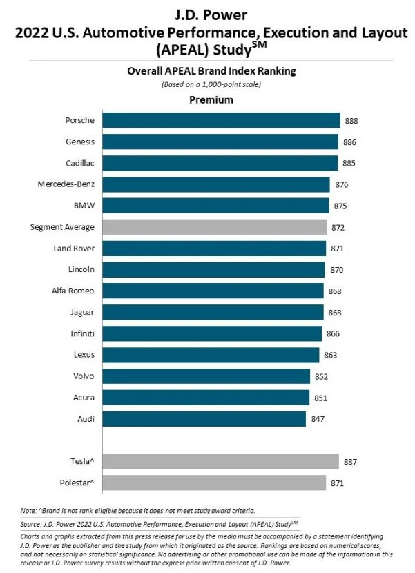 After two consecutive years at the top of the rankings, Porsche has edged out Tesla in the J.D. Power 2022 APEAL study. Porsche scored a total of 888 points (out of 1,000), while Tesla was just behind with a score of 887.