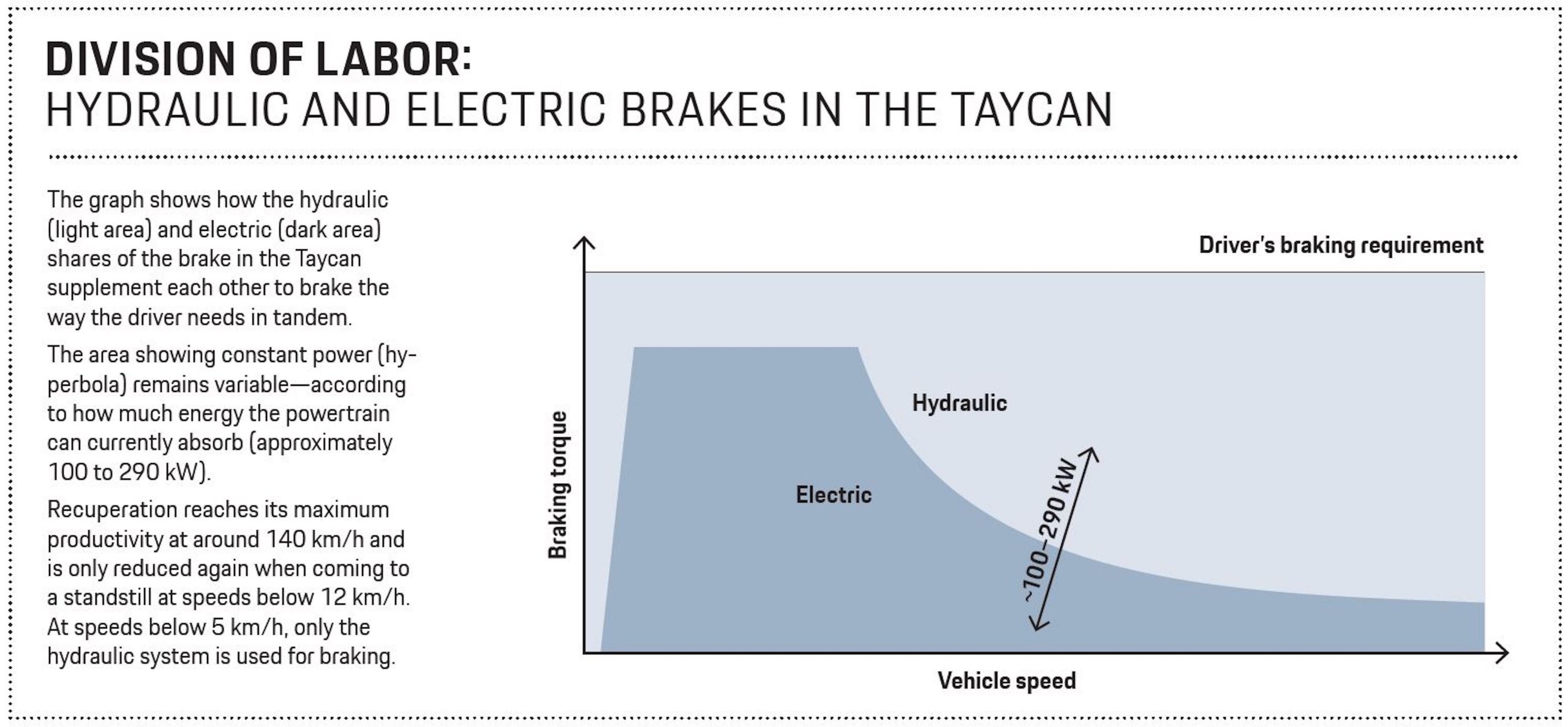 “The vehicle brakes at regular intervals using the hydraulic system only, and without the electric motors, to remove dirt from the discs,” Porsche explains.