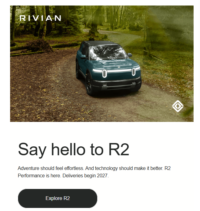 Rivian also plans an entry-level R2 variant starting at $45,000, scheduled for late 2027, with an estimated range of 275 miles (442 km). Additional specifications for that model have not yet been released.