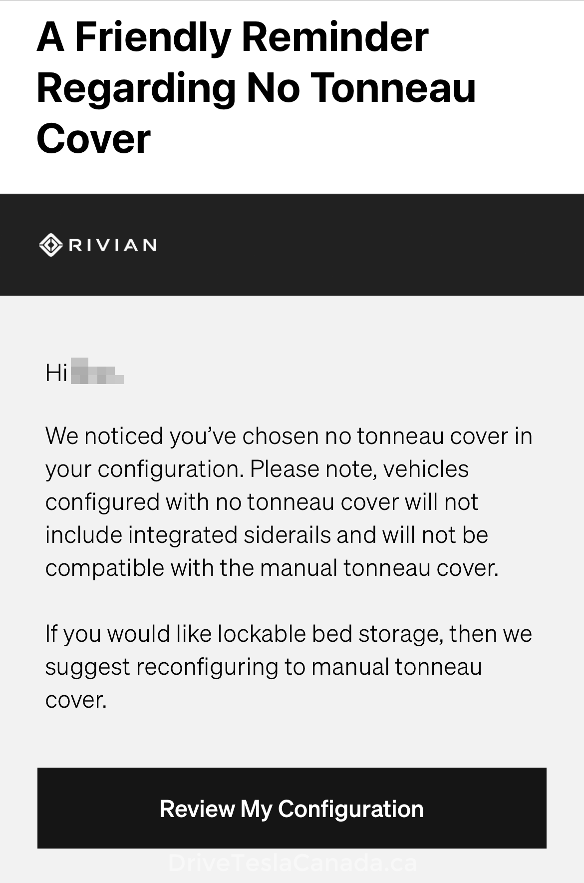 Along with the email notifying reservation holders that the manual cover is coming soon, Rivian is also letting customers know that need to update their configuration to include a cover, or their R1T will be built without integrated siderails. This is significant as it will mean they will not be able to use the manual cover if they decide to purchase it after taking delivery.