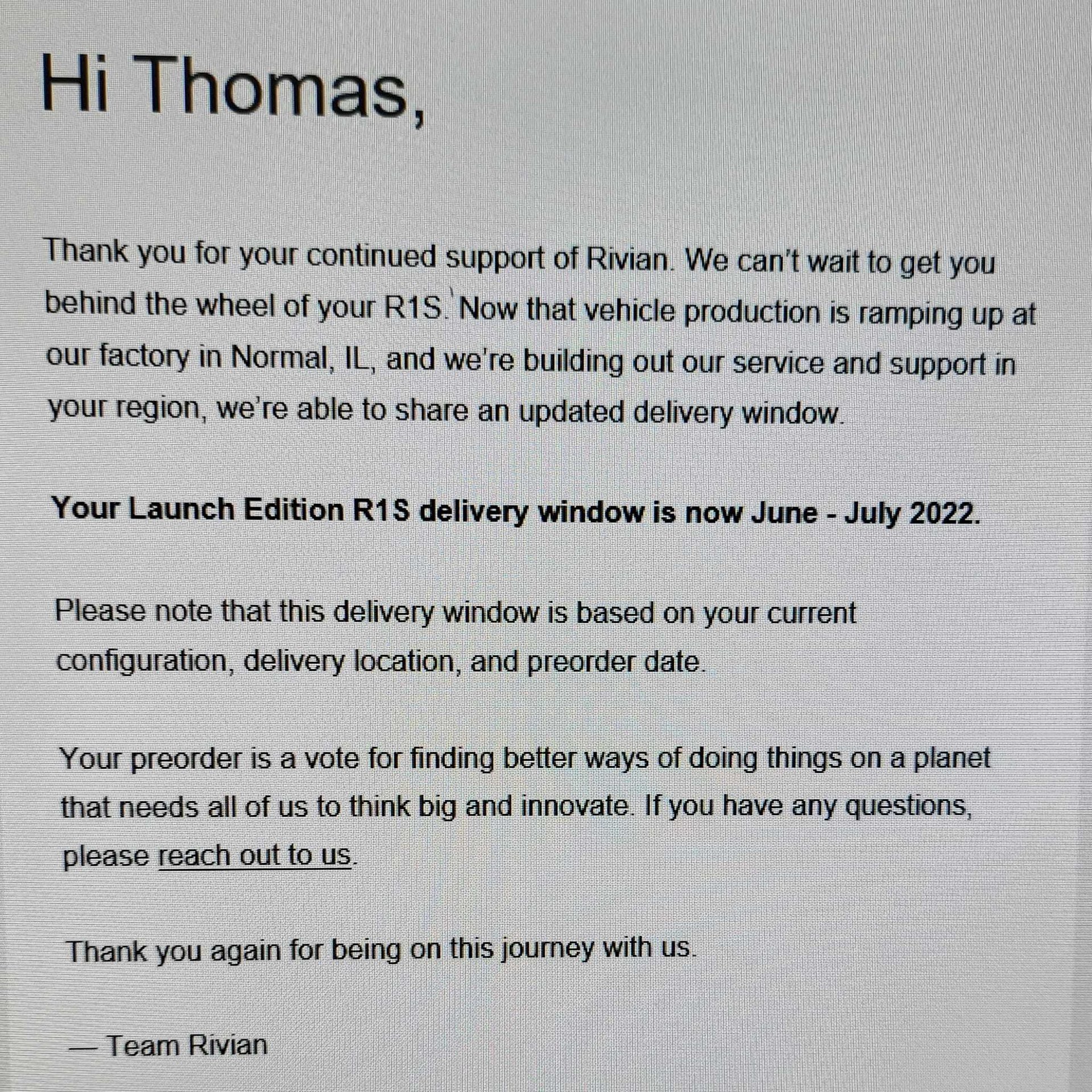 One customer in Alberta has been advised that his delivery window is now between July to September 2022. The email was sent this morning and shared on the Rivian Owners Forum.
