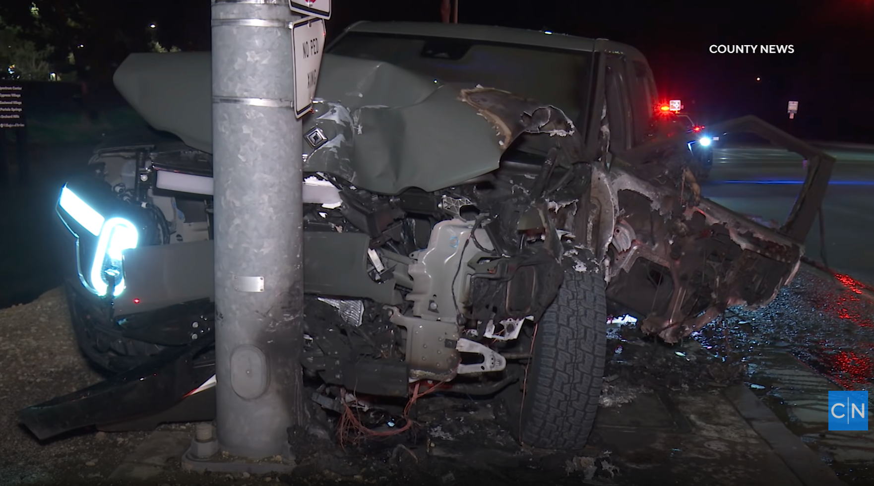 According to the California Highway Patrol incident log, at least one witness said the R1T exited the freeway at a high rate of speed when the driver lost control and hit the traffic pole. (via County News)