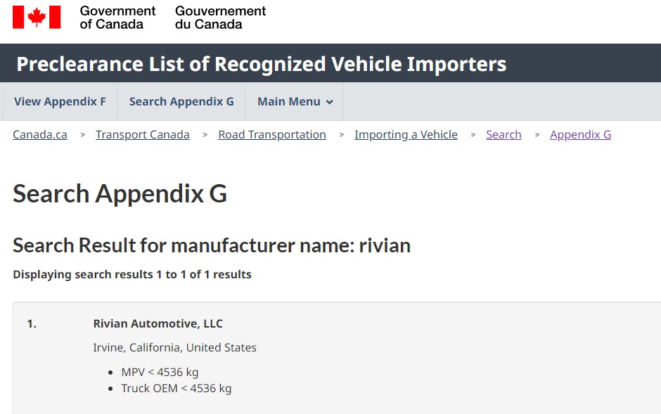 The Transport Canada website for the ‘Preclearance List of Recognized Vehicle Importers’ has already been updated to include Rivian, showing that both the R1T (Truck OEM) and R1S (MPV) are included in the certification.