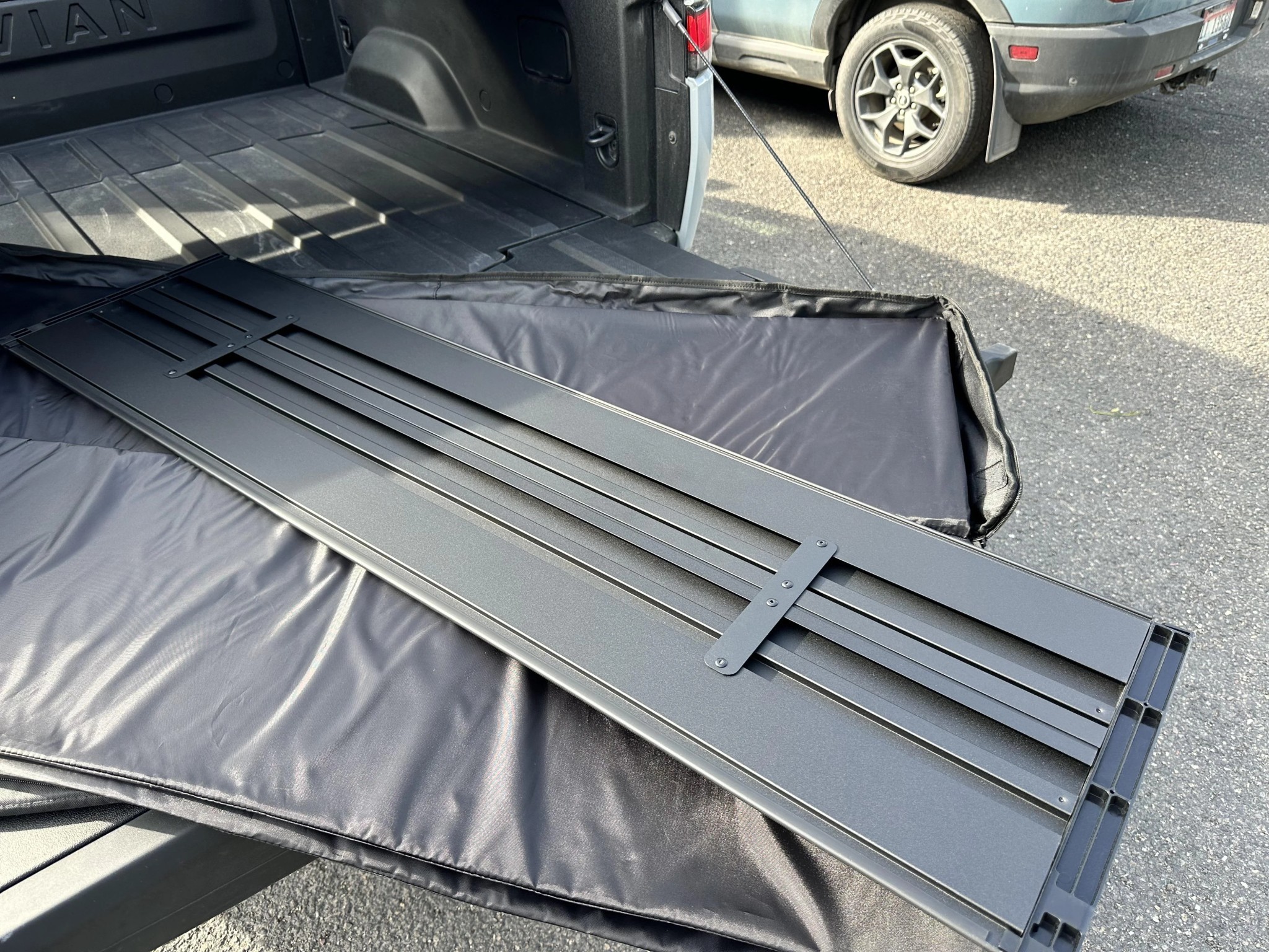 Thanks to an R1T owner on Reddit, we have our first glimpses, and it comes as advertised by RJ Scaringe just a few weeks ago. It comes with a zipper case that weighs in at 42lbs and fits into the gear tunnel. The entire cover is a set of four interlocking aluminum panels with plastic end pieces.