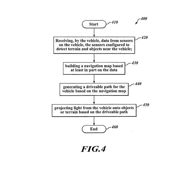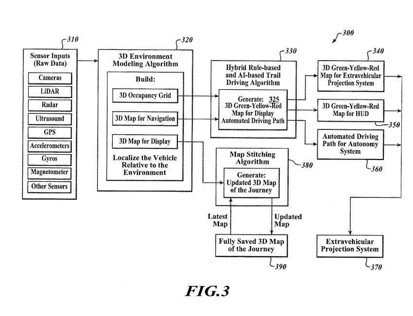 The patent includes at least one sensor to detect terrain and objects near the vehicle. In addition, it also has at least one sensor to determine the navigation path for the vehicle to follow.