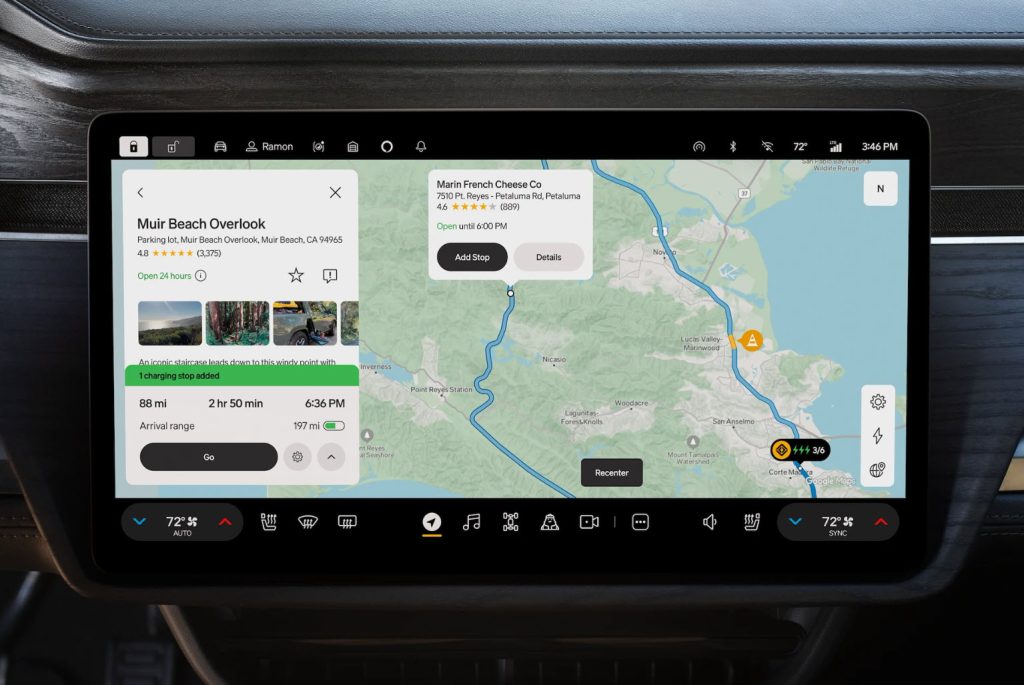 The update is also coming to the Rivian mobile app, allowing users to plan routes, check charging locations, share destinations, and view updated place information like operating hours, ratings, and photos—all sourced from Google Maps.