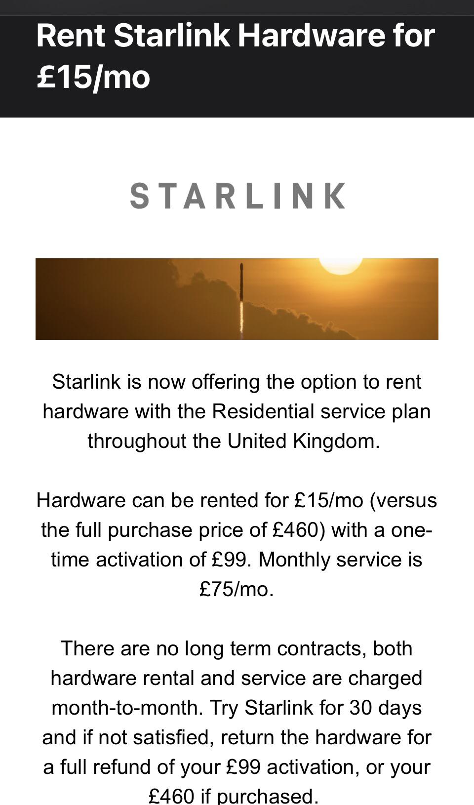 SpaceX confirms in the email there is no long-term contract, as users pay monthly for both the hardware and subscription. Users can also try Starlink for 30 days and return the dish if they are unhappy, with their full 99 pounds activation fee refunded.