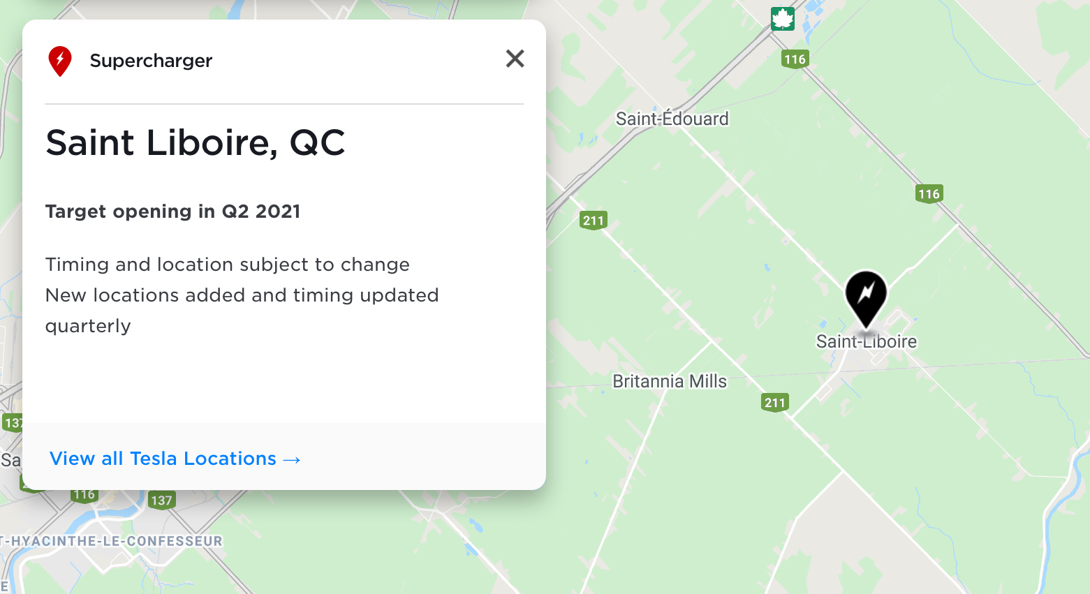 Tesla’s St-Liboire Supercharger will be installed at the Irving truck stop at 1144 Rang Saint-Edouard. It is due to open in the 2nd quarter of 2021.