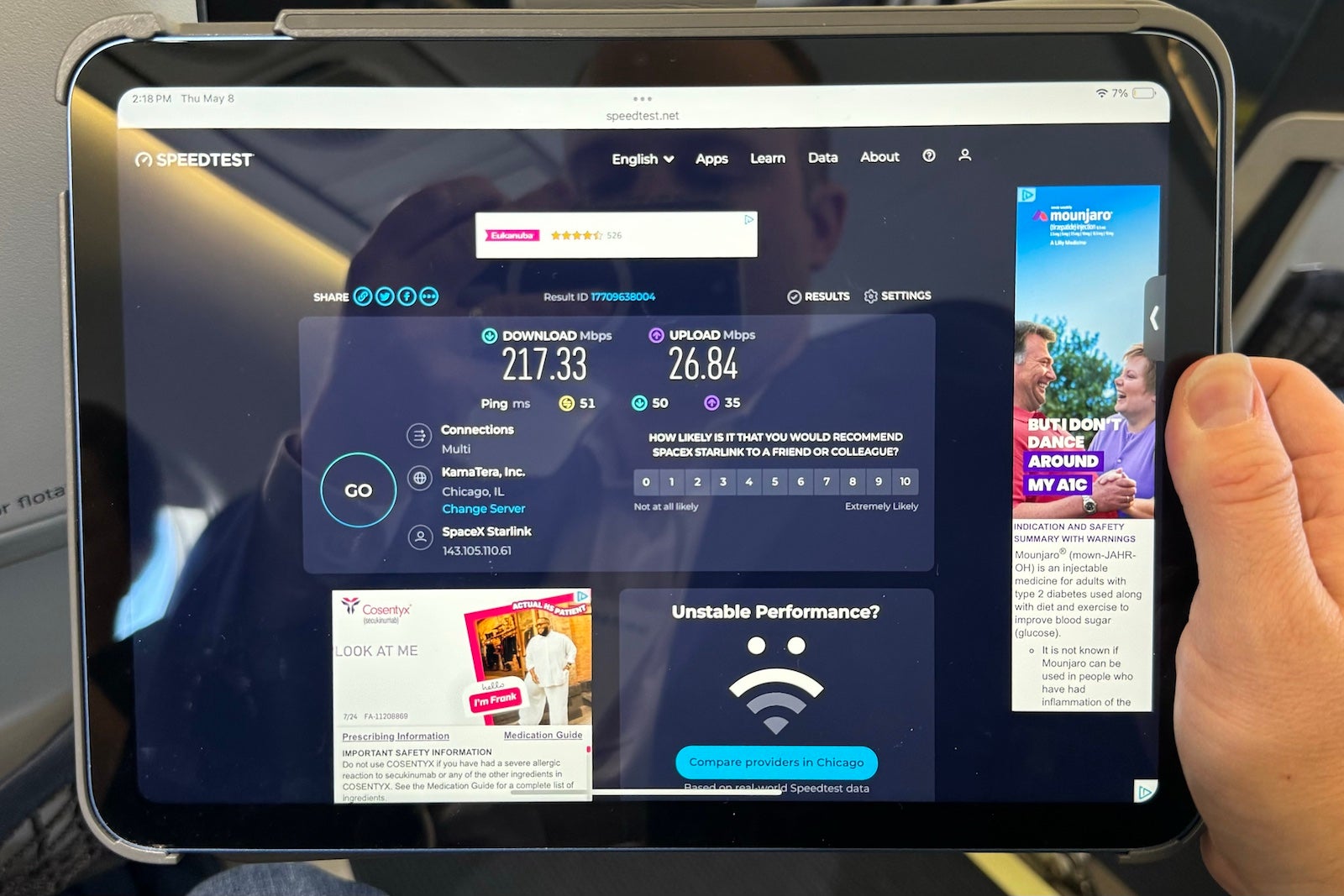 Network speeds of 217 Mbps download and 26.8 Mbps upload were achieved at 35,000 feet, with The Points Guy calling the performance “faster than some home internet.”