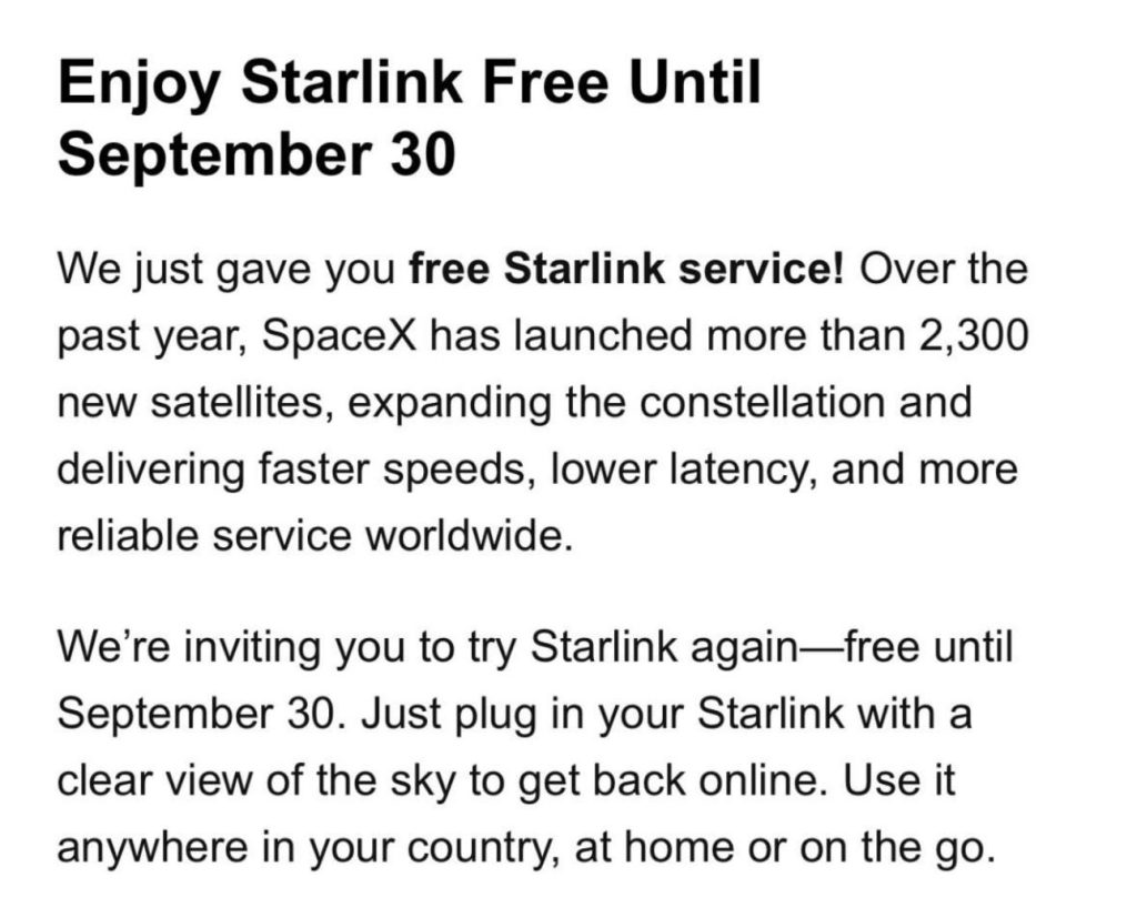 According to the company’s email to former customers, those who previously canceled or suspended their accounts can return to Starlink at no charge through September 30. The promotion, worth up to C$140/US$120 depending on the regional plan, only applies to service lines that received the official invitation email.