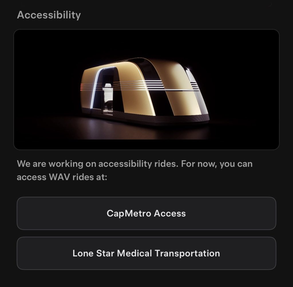 While Tesla develops its own solution, the company points riders toward CapMetro Access and Lone Star Medical Transportation.