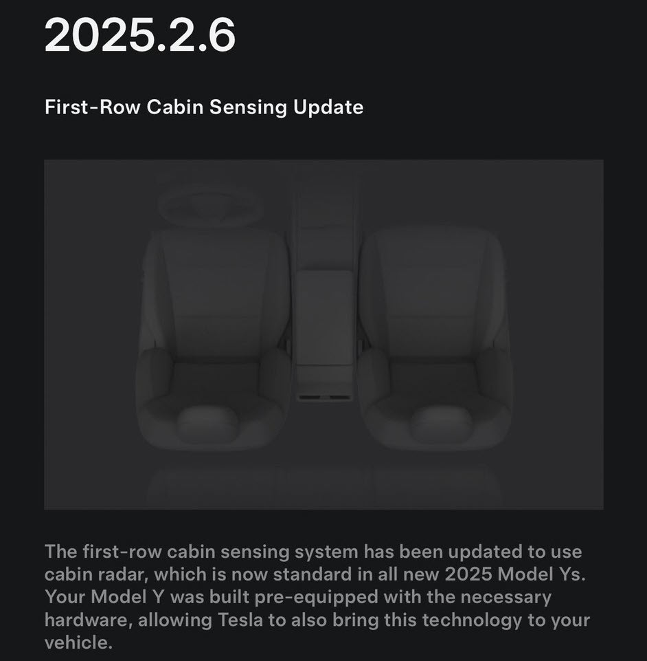 “The first-row cabin sensing system has been updated to use cabin radar, which is now standard in all new 2025 Model Ys. Your Model Y was built pre-equipped with the necessary hardware, allowing Tesla to bring this technology to your vehicle,” the release notes of software update 2025.2.6 read.