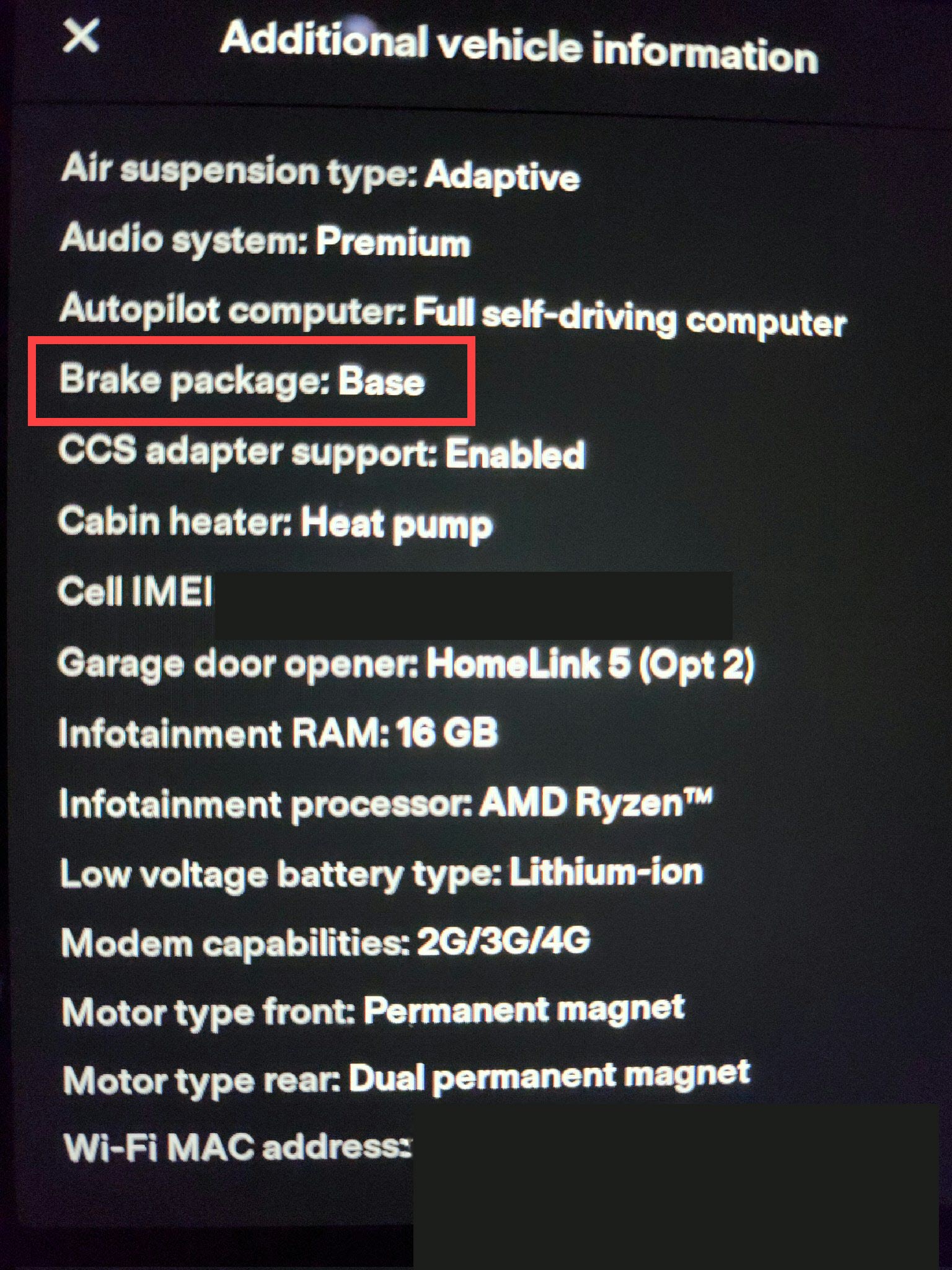 But that wasn’t the only change Tesla made on Monday as there is a new addition to the “Additional Information” screen on the in-car display which now shows ‘Brake package: Base’ for existing owners. This was a server side change and required no software update for it to appear and was confirmed by one of our readers @EndlessPlaid who shared this photo with us.