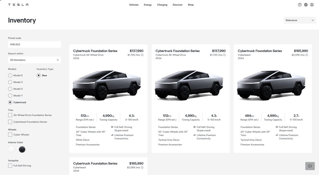 Based on a review of the existing inventory website by Drive Tesla, there are Cybertrucks currently available in inventory across the country. At the time of publication we were able to see four in Vancouver, one on Vancouver Island, three in Calgary, two in Edmonton, none in Manitoba or Saskatchewan, more than twenty in and around Toronto, and several in Quebec.