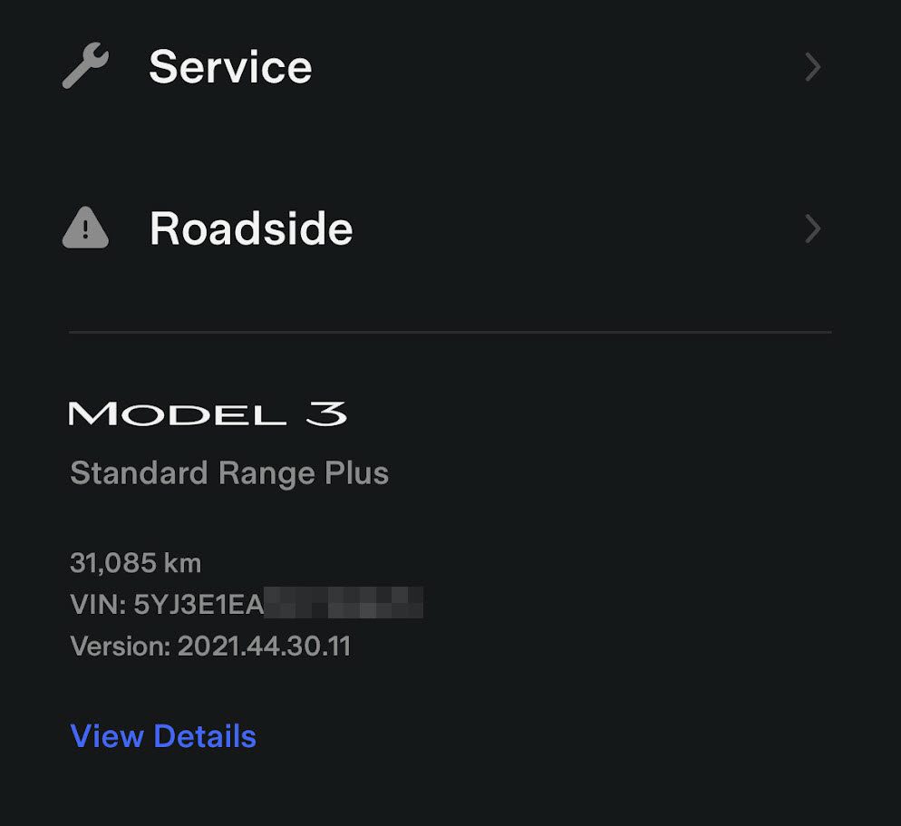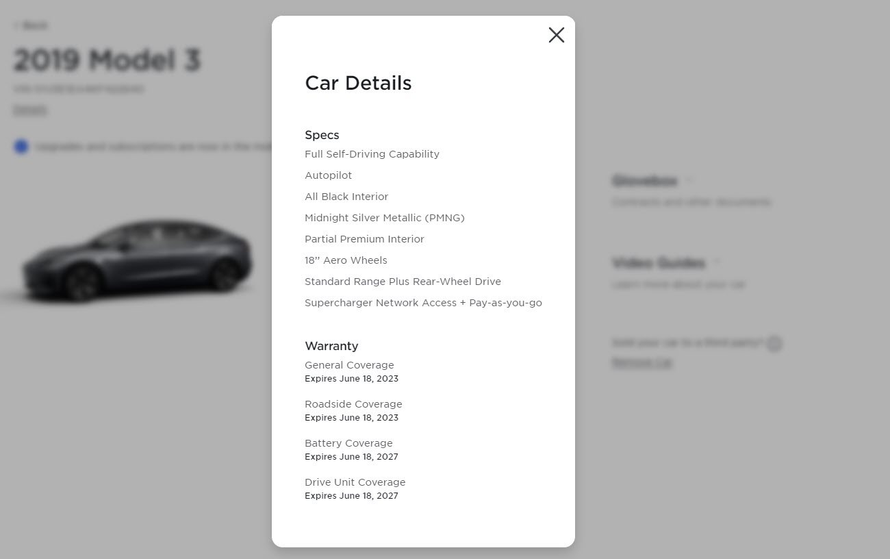 The first contains the specs of your vehicle, including which model Tesla you have, your paint, interior, and wheel options, and if you have Autopilot and Full Self-Driving (FSD) Capability.
