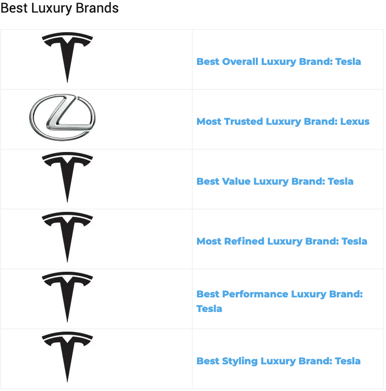 In the Best Luxury Brand category, Tesla showed off its dominance in that segment by taking home 5 of the 6 awards. The only award it didn’t win, Most Trusted Luxury Brand, was won by Lexus for the fifth year in a row.